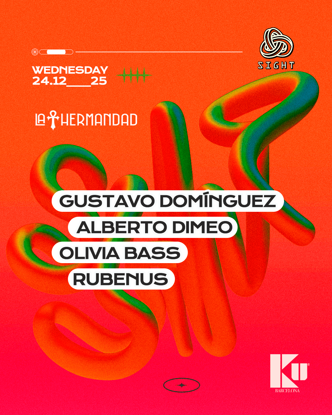 In a union of rhythm and community, SIGHT and La Hermandad joined forces at Ku Barcelona for a night that blended house and techno with emotional depth. With performances by Gustavo Dominguez, Alberto Dimeo, Olivia Bass, and Rubenus, the event captured the essence of collaboration between two collectives that share the same vision: connection through music, energy, and underground culture.
